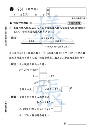 【學習目標】/ 第7冊 / TOP ‧1.學習使用文字式來表示數量的關係。 ‧2.理解等式的性質,並學習利用此性質來解方程式。 ‧3.學習利用移項、去括號、去分母等方法來解方程式。