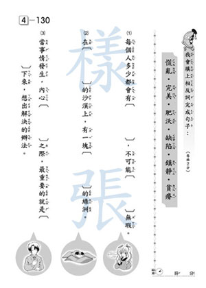 【學習目標】/ 第3冊 / TOP ‧1.透過文章的閱讀,繼續學習新的生字。 ‧2.以辨別類似字、反義詞、類比等課題,學習詞義,增加詞彙量。 ‧3.「成語學習站」,讓孩子出口成章,在句型及寫作表現上流暢優美、簡潔生動。 ‧4.遣詞造句練習,提高句型表達能力,延展寫作能力。 ‧5.利用三級教材養成的詞彙能力與讀解能力,培養長文的閱讀能力,豐富知識。 ‧6.理解閱讀過程所觀察到的訊息,培養分析歸納及創造思考的能力,並回答問題。 ‧7.「作文引導十」,教導孩子「推理寫作」的方法。 ‧8.「國字注音大集合」,引導復習語詞及注音。